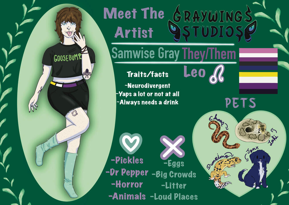Salutations! I'm a 24 y/o multi media artist and a free lance illustrator, based in Canada. I do animal education as well! I speak on exotic pet care, welfare, conservation and more! I'm a pet parent to a doggy and 4 exotic pets <3 (plus 1 bonus spider)